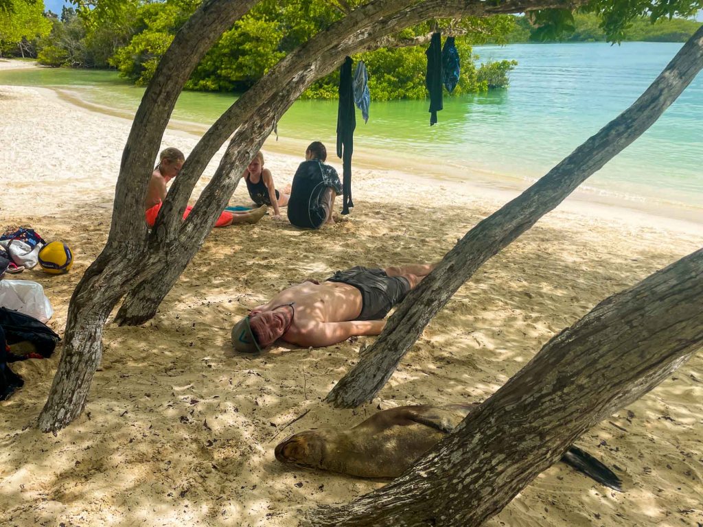 The last day we decided (after two Americans recommended it to us) to go snorkeling on our own at the „La Perla beach“ right next to the small village we stayed at (Puerto Villamil). So we did that. And surprisingly in addition to the many colorful fish we saw some Iguanas and sea lions decided to join – pretty cool.